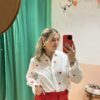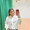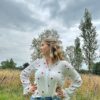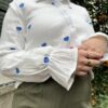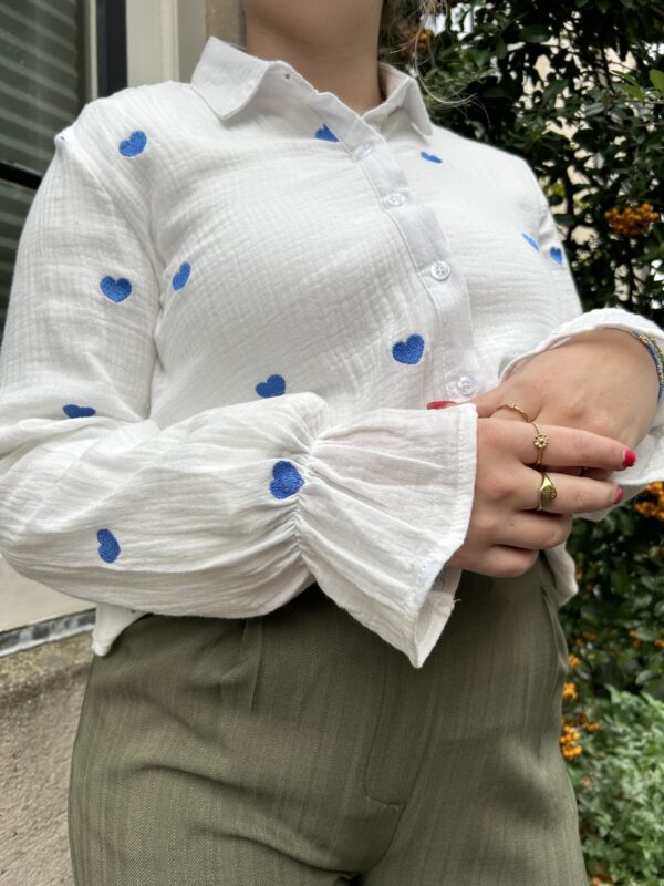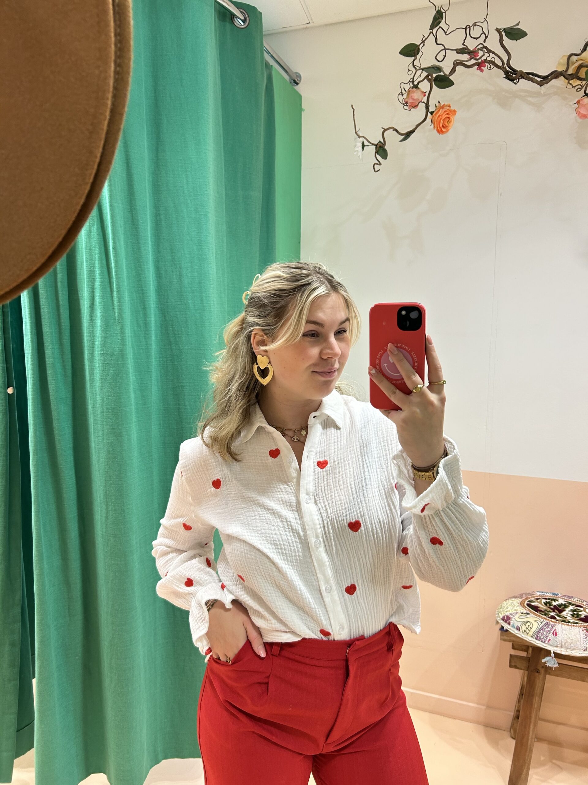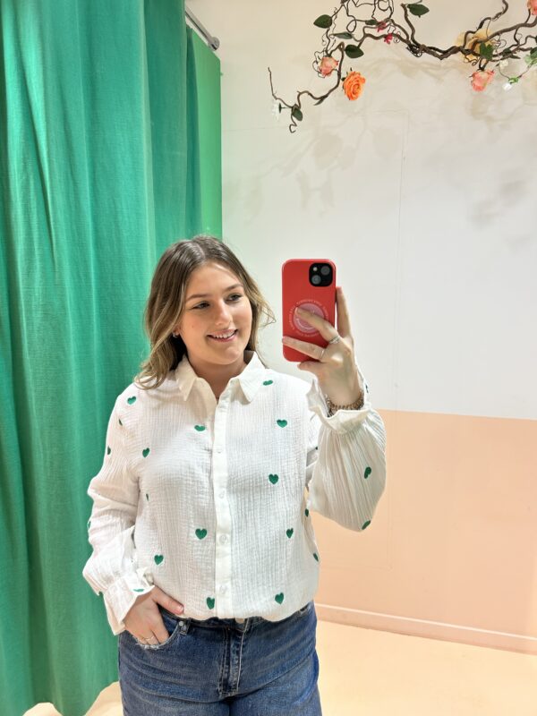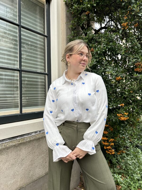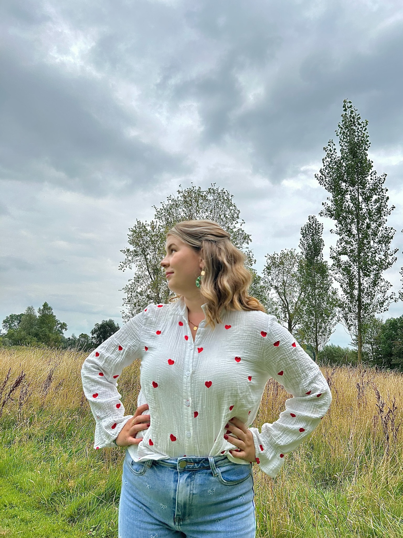Met deze hartjesblouse geef je iedere outfit een vrolijke en lieve touch. De zachte en luchtige stof zorgt ervoor dat de blouse mooi valt en de elastieken boord aan de mouw geeft een speels effect. Deze blouse kun je op verschillende manieren dragen, zowel met een mooie jeans als een leuk rokje. Op koudere dagen draag je hem gemakkelijk door met een matchende spencer of vest over de blouse.